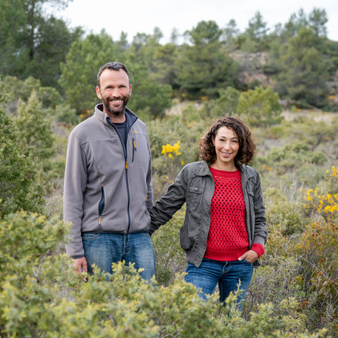 A l'origine du domaine: Julien qui représente la 4° génération de viticulteurs et Mélanie, également issue du monde viticole, qui travaille en parallèle comme guide-conférencière en cœur d'Hérault.